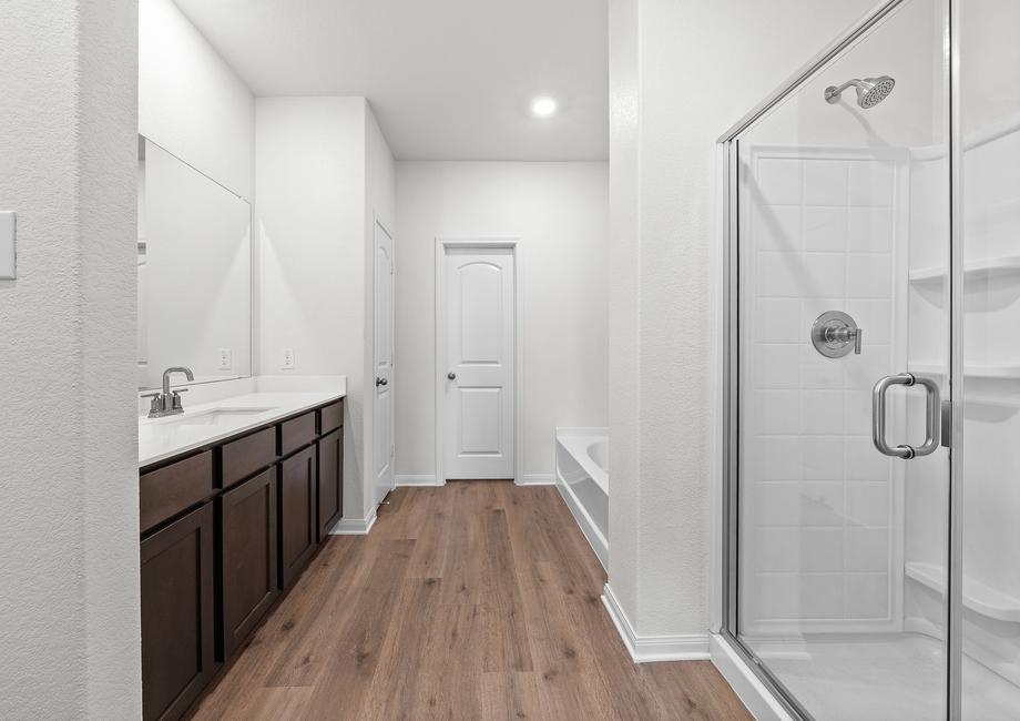 With the Cypress your master suite is your sanctuary. Natural light flows through the bay windows, providing your room with an airy and serene atmosphere. After a long day, relax in the soaking tub in your beautiful, attached bath. Additionally, your suite has a linen closet and large walk-in closet for plenty of storage.