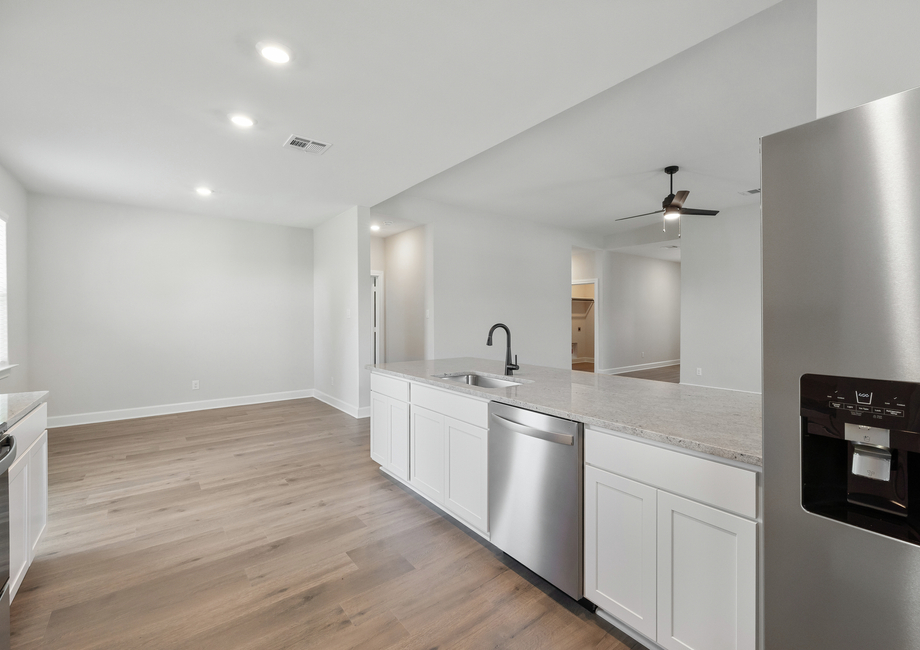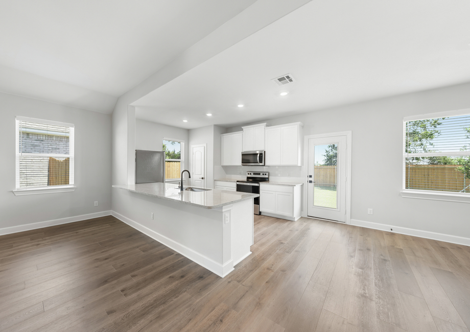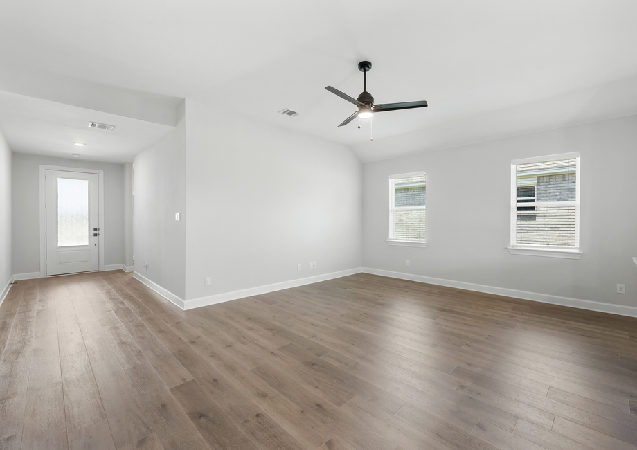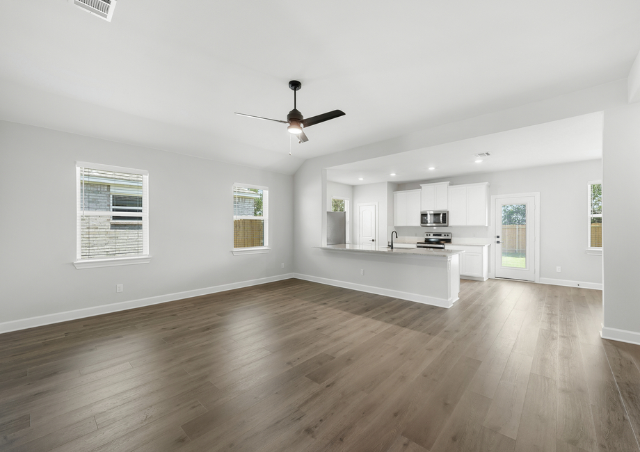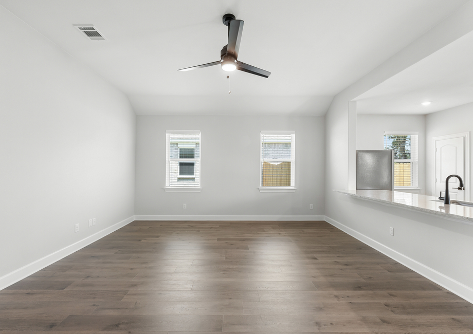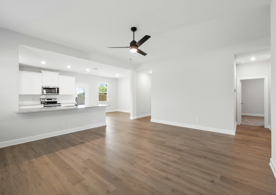 The spacious family room of the Reed plan puts comfort and relaxation first. Characterized by an abundance of natural light flooding in through numerous windows, the family room has an airy ambiance, inviting the outdoors in and infusing the room with warmth. With its generous layout, there's ample space for furniture, ensuring that everyone has a cozy seat to unwind and enjoy moments together. Whether it's lounging with loved ones or hosting gatherings, this bright and spacious family room promises endless comfort and joy.