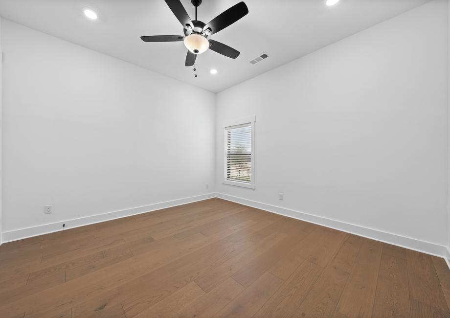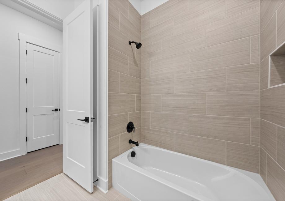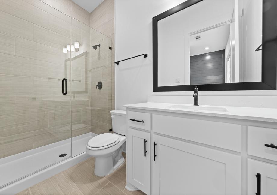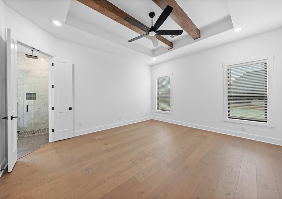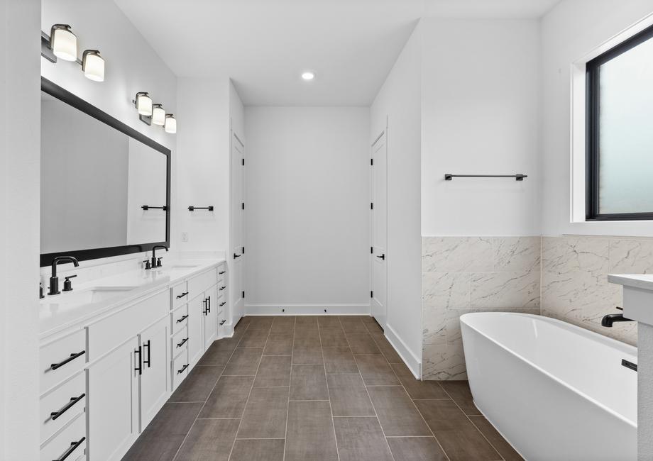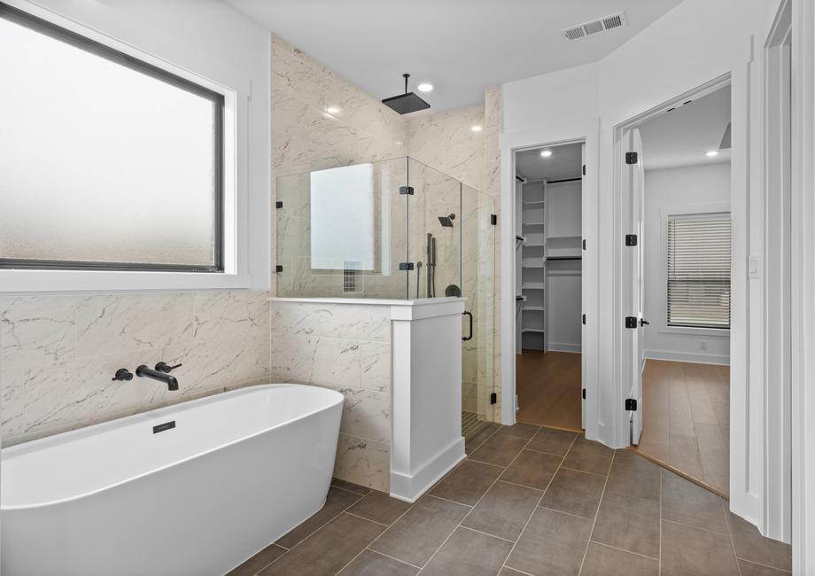 The master suite of the Mantle II is the perfect space to begin and end each day. Tucked away in the back of the house, the master suite features large windows that fill the room with natural light. The en-suite master bath includes an oversized dual-sink vanity, a glass-enclosed shower and a stunning free-standing tub. Inside the master bathroom, homeowners will enjoy the two walk-in closets, one of which has convenient access to the laundry room.