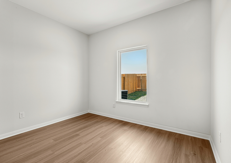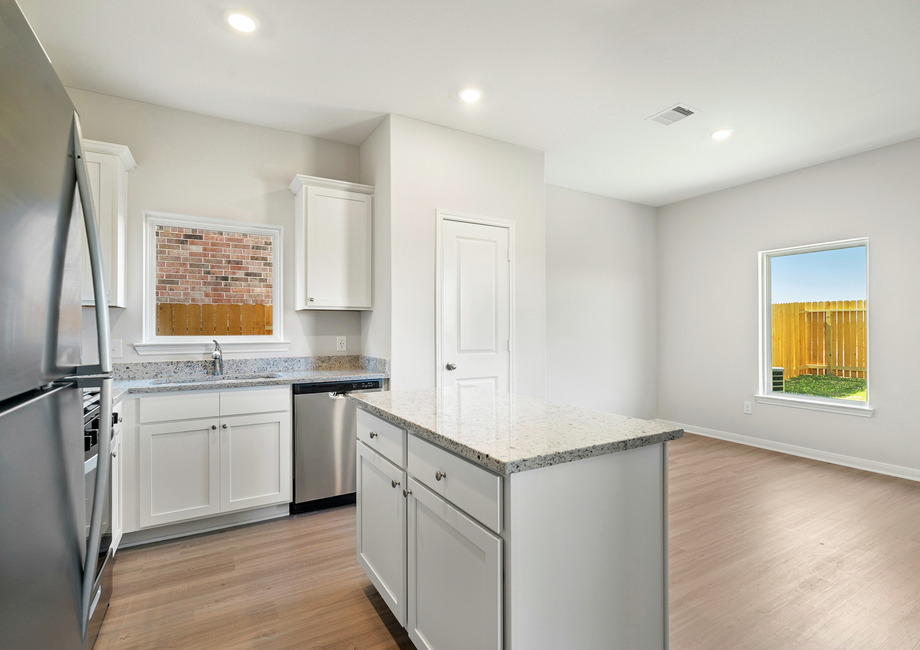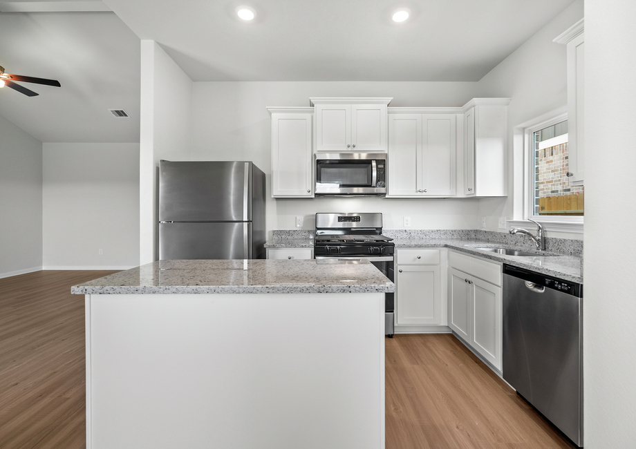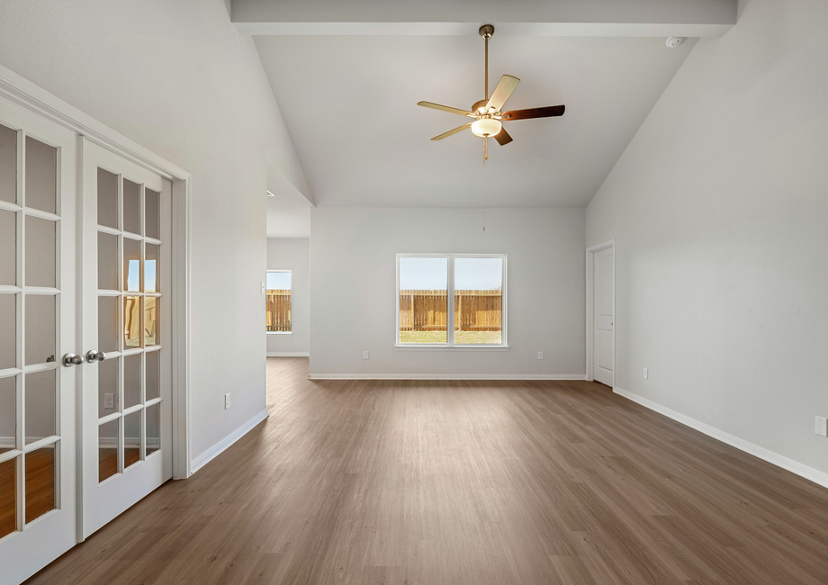 Three bedrooms, an additional flex room and a open-concept entertainment space are all found in the Ranch floor plan at Freeman Ranch. The chef-ready kitchen features granite countertops, a full suite of stainless steel appliances and a beautiful island. An adjoining dining room has a door that leads to the back covered patio. A large window that overlooks the beautiful private back yard adds beautiful natural light to the family room.