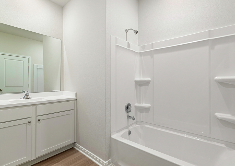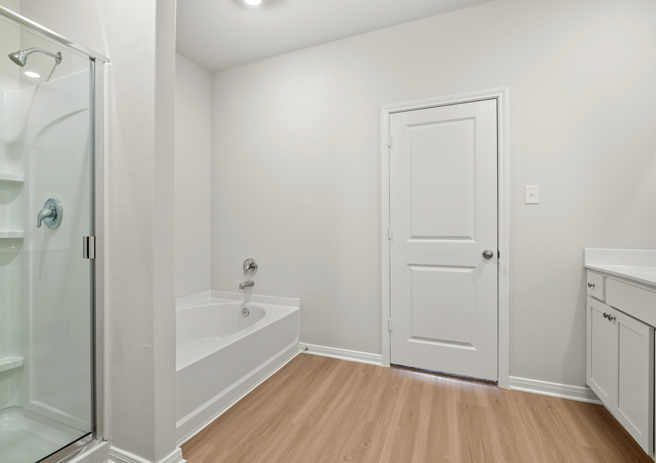 Comfort and luxury are both found in this master retreat. The spacious bathroom is designed for relaxation, featuring a separate soaking tub and a walk-in shower with upgraded features. A generously sized vanity offers plenty of counterspace and storage for daily essentials. The retreat also feature a sprawling walk-in closet with ample shelving and hanging space for any wardrobe. This master retreat offers the perfect blend of functionality and elegance, creating a beautiful space for you to unwind.