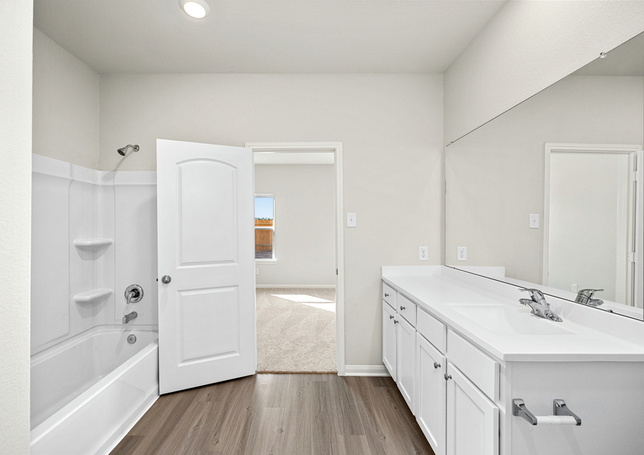 The owner’s suite of the Pecan offers the privacy and space you need to relax and recharge each day. Enjoy peaceful views of the back yard from the spacious master bedroom, and soak in the serenity of an attached bathroom offering plenty of storage with a sprawling vanity and linen closet. A spacious walk-in closet allows plenty of space for your wardrobe essentials.