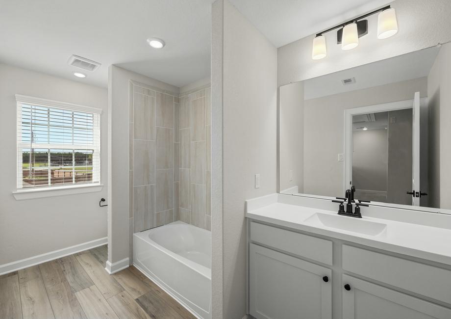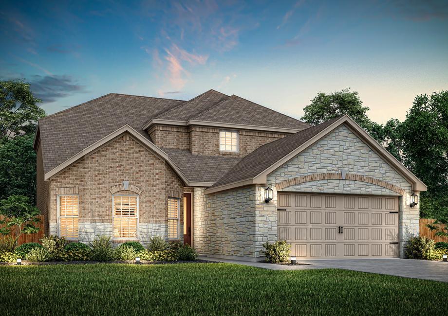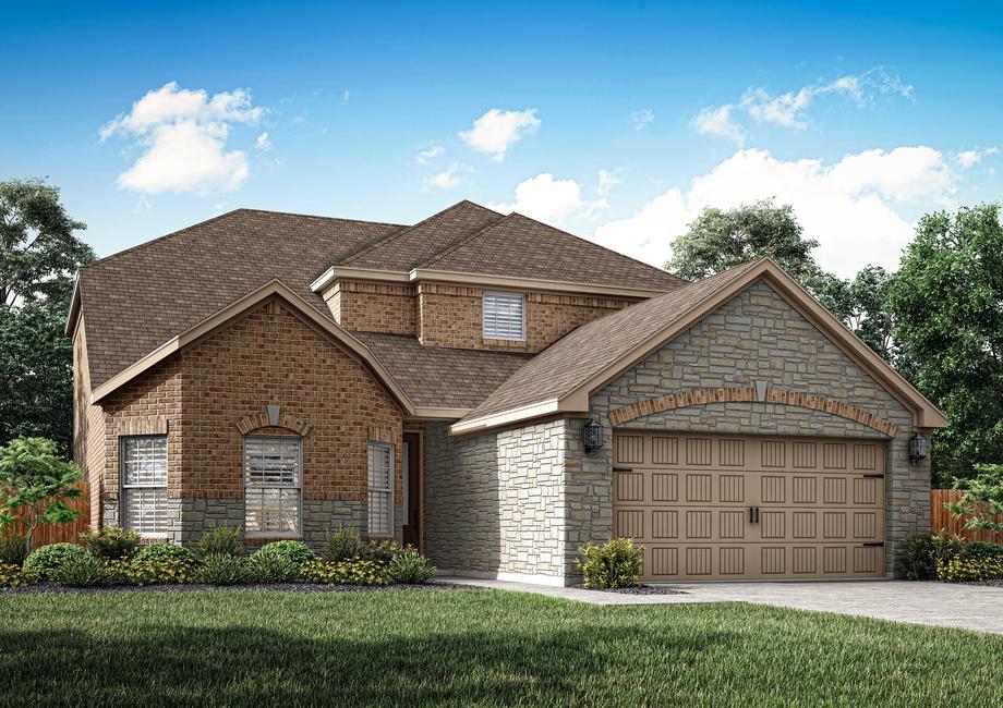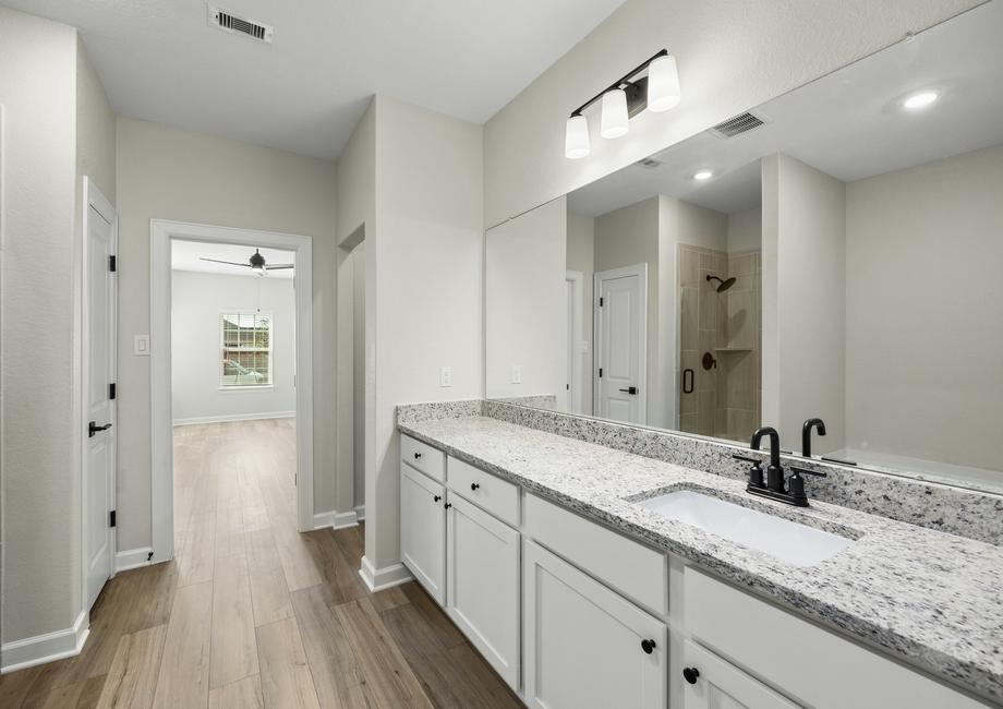 As you enter the Martin, the welcoming foyer guides you towards a spacious family room perfect for gatherings and relaxation. To the right, you'll discover a chef's dream kitchen with stainless steel appliances and striking granite countertops complemented by a cozy dining area. The downstairs master bedroom, bathed in natural light from bay windows, includes a large walk-in closet and a spa-inspired master bathroom featuring a walk-in shower and a standalone soaker tub. Upstairs, three secondary bedrooms each feature their own walk-in closet and share a generously sized secondary bathroom.
