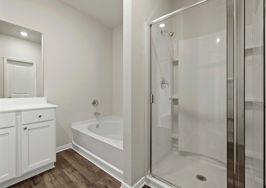 Homeowners will look forward to spending time in their private retreat in this home. The spacious bedroom easily accommodates your king-sized bedroom furniture. An exceptional walk-in closet provides plenty of space to keep your wardrobe and accessories organized and out of sight. The attached bathroom is stunning, and features a soaker tub, step-in shower and a spacious vanity.