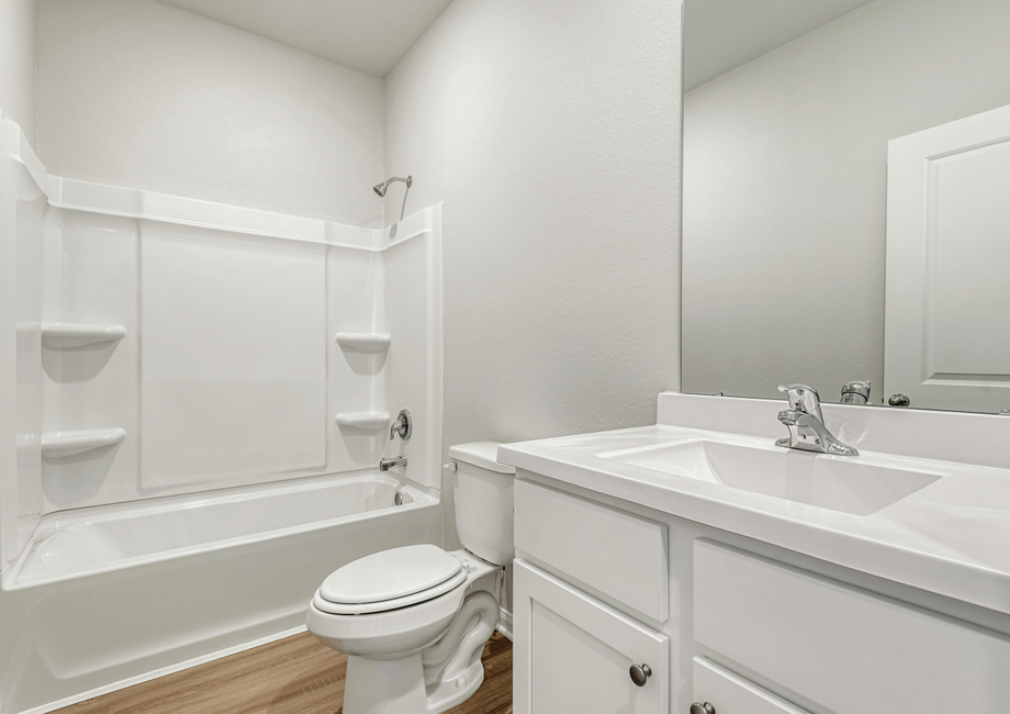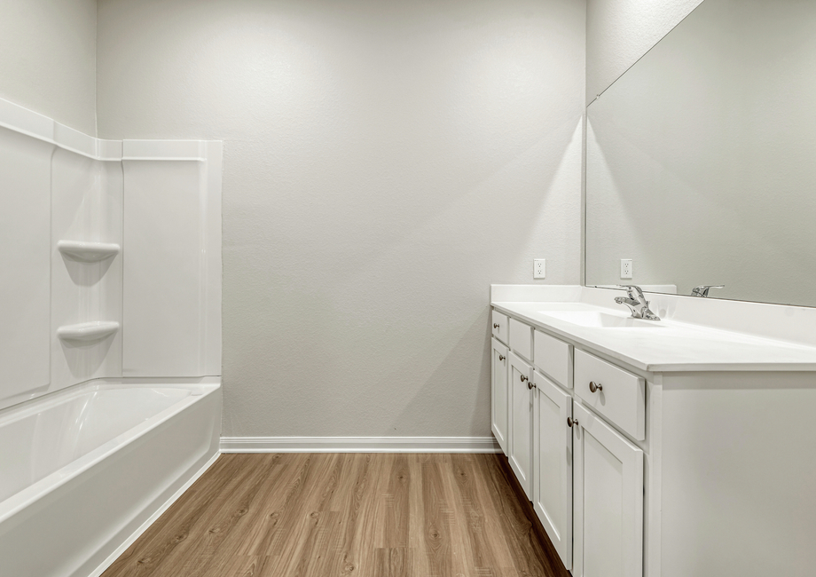The private master suite of the Dogwood offers abundant space for rest and relaxation. Enjoy views of the back yard from the spacious bedroom. Pamper yourself in the spacious attached bathroom, showcasing a shower/tub, spacious vanity and linen closet. To top it off, this suite features a huge walk-in closet offering abundant storage space.