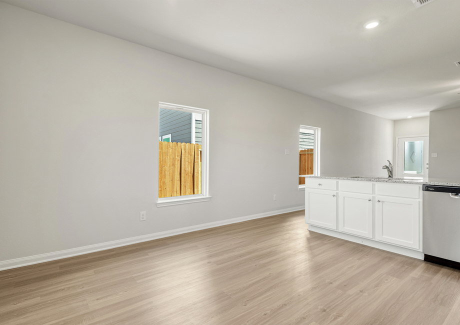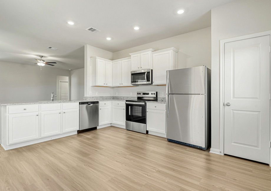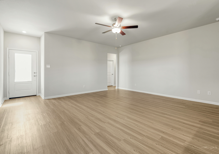 The open-concept Pecan provides the perfect space for hosting family and friends. Everyone will want to spend time in the beautiful and spacious kitchen of the Pecan. Meal prep is a breeze with energy-efficient Whirlpool® appliances and polished granite countertops. High-grade wood cabinets provide the storage you need to keep everything organized and close at hand. A breakfast bar connects the kitchen to the sprawling family room, featuring a ceiling fan and access to the back yard. This room is large enough to accommodate a large sectional sofa, coffee and end tables, plus a huge TV and entertainment unit.