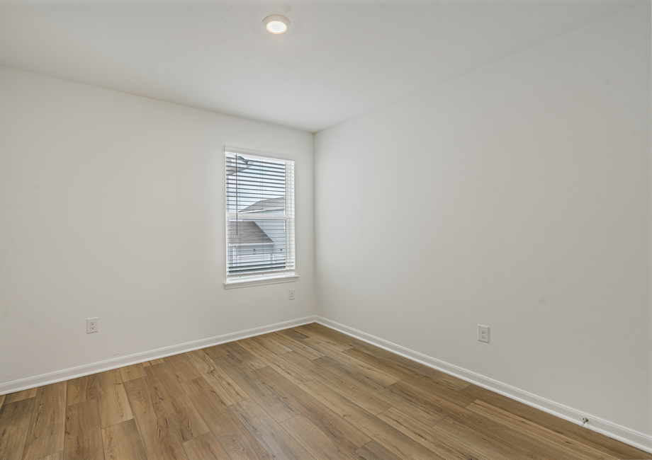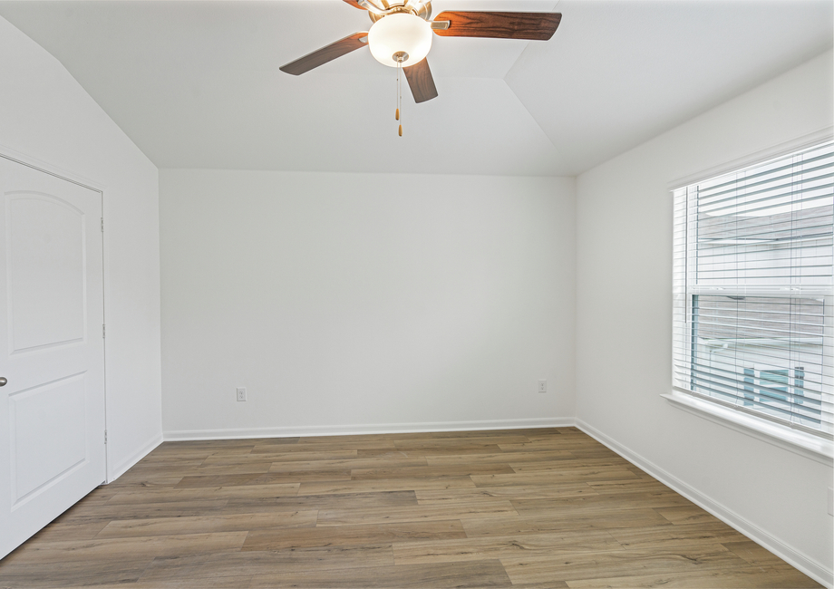 The master suite of the Halpert plan is the ideal space for relaxing and unwinding after a long day. Highlighted by a large window offering peaceful back yard views, this suite showcases an abundance of space and a generously sized closet. The en-suite master bath offers a beautiful vanity with great counter and cabinet storage, as well as an oversized, enclosed shower.