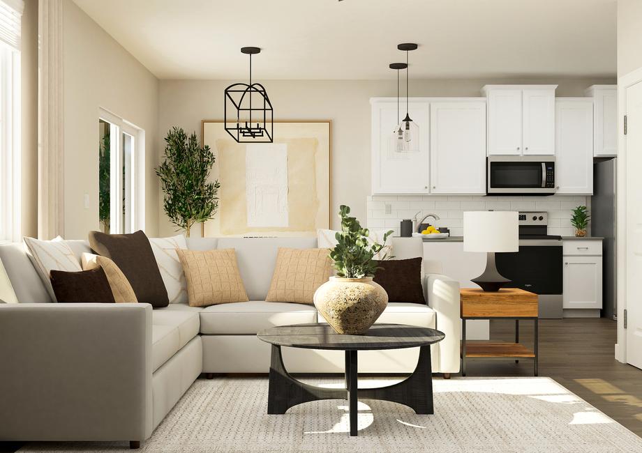 Thoughtful design and exciting extra features make the Aspen an ideal home for hosting friends and family. The chef-ready kitchen showcases polished quartz countertops, white tile backsplash, recessed lighting and 42” upper wood cabinets! A breakfast bar separates the kitchen from the family room, providing the ideal place for serving food or grabbing a quick bite.