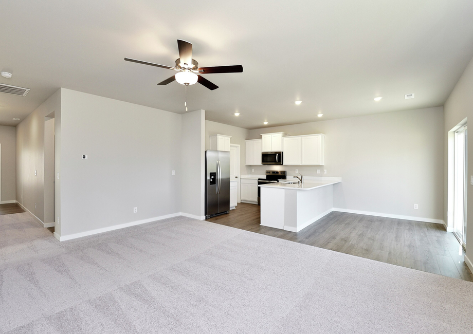 Welcome to the beautifully designed Bainbridge floor plan, where functionality meets comfort in a thoughtfully crafted single-story layout. This home features three spacious bedrooms and two full bathrooms, offering ample room for both relaxation and entertainment. The primary suite is privately located at the rear of the home and includes a walk-in closet and luxurious primary bathroom with a dual-sink vanity and a step-in shower. The open-concept family and dining rooms seamlessly connect to the modern kitchen, which boasts sleek countertops, a large island, and a walk-in pantry making it perfect for family gatherings or hosting friends.