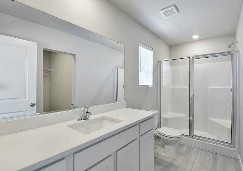 Upstairs, you’ll find all three bedrooms thoughtfully arranged for privacy and comfort. The spacious primary suite includes a large walk-in closet and a luxurious en-suite bath with a large sink and a step-in separate shower. Two additional bedrooms, each with generous closet space, share a full bathroom. A conveniently located laundry room and extra hallway storage make everyday tasks easier, while the upstairs layout ensures everyone has a space to unwind and recharge.